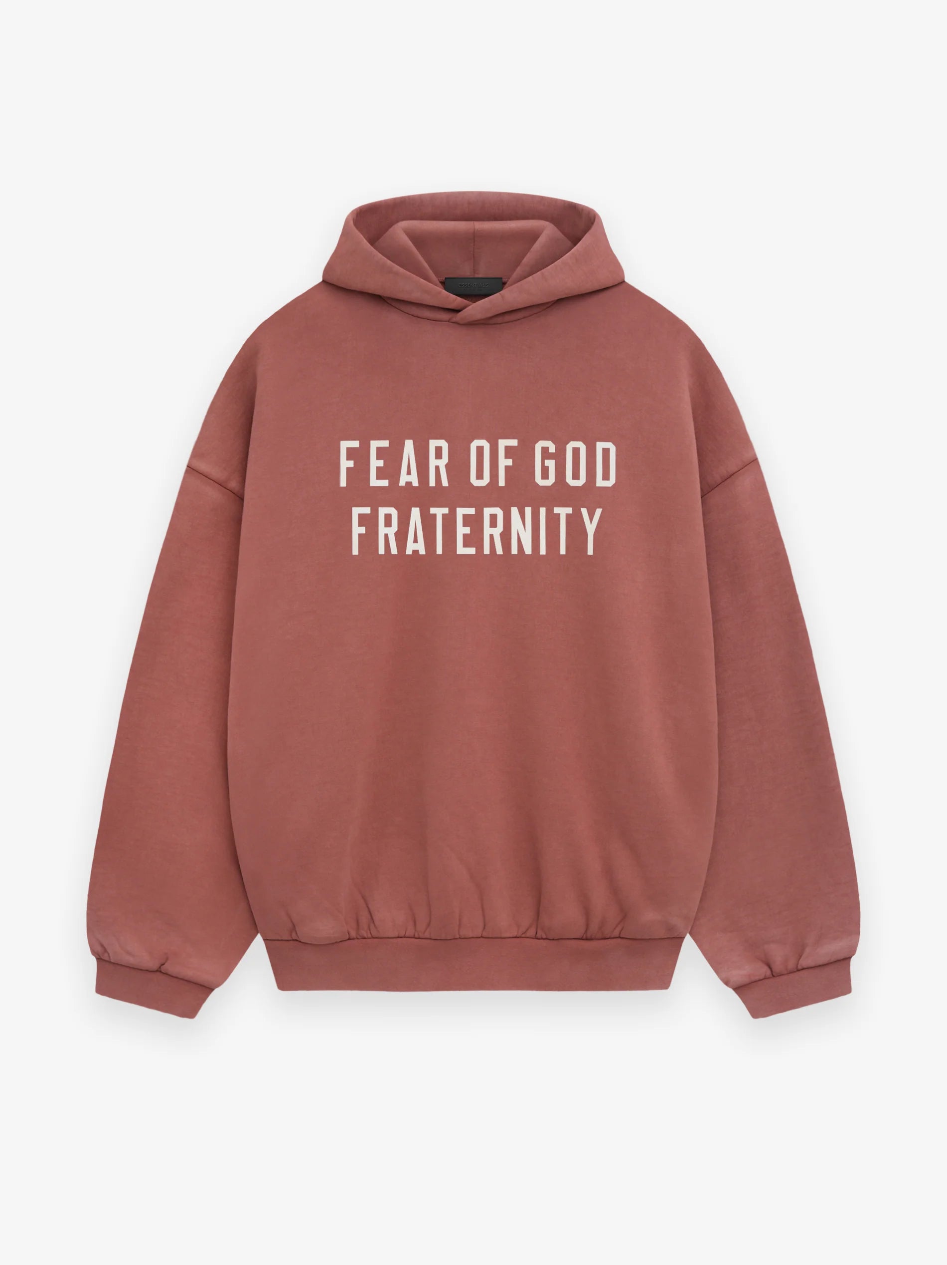 The Heavy Fleece Hoodie is made from heavyweight 520gsm, 100% cotton fleece in a vintage wash. The designed volume creates a round, cropped silhouette. A collegiate-inspired "Fear of God Fraternity" graphic is screen-printed on the front. Details include an overlapped neckline hoodie, rib-knit cuffs, waist-hem, and side pockets. The Essentials Fear of God rubberized label is stitched on the hood.