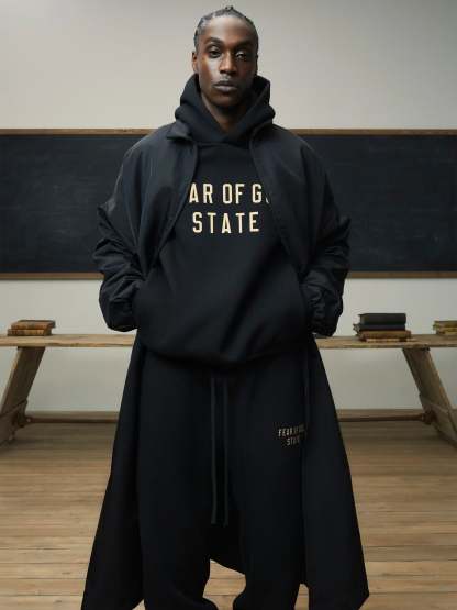 The Essentials Sweatpant has been upgraded in a heavier 480gsm core fleece to provide additional body and structure. A "Fear of God State" collegiate graphic is screen-printed on the leg. Additional details include an encased elastic waistband with elongated drawstrings, and side seam pockets. The Essentials Fear of God rubberized label is at the center front.