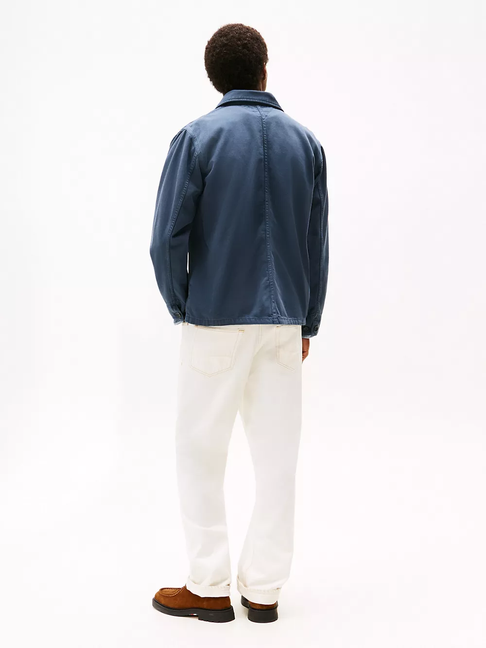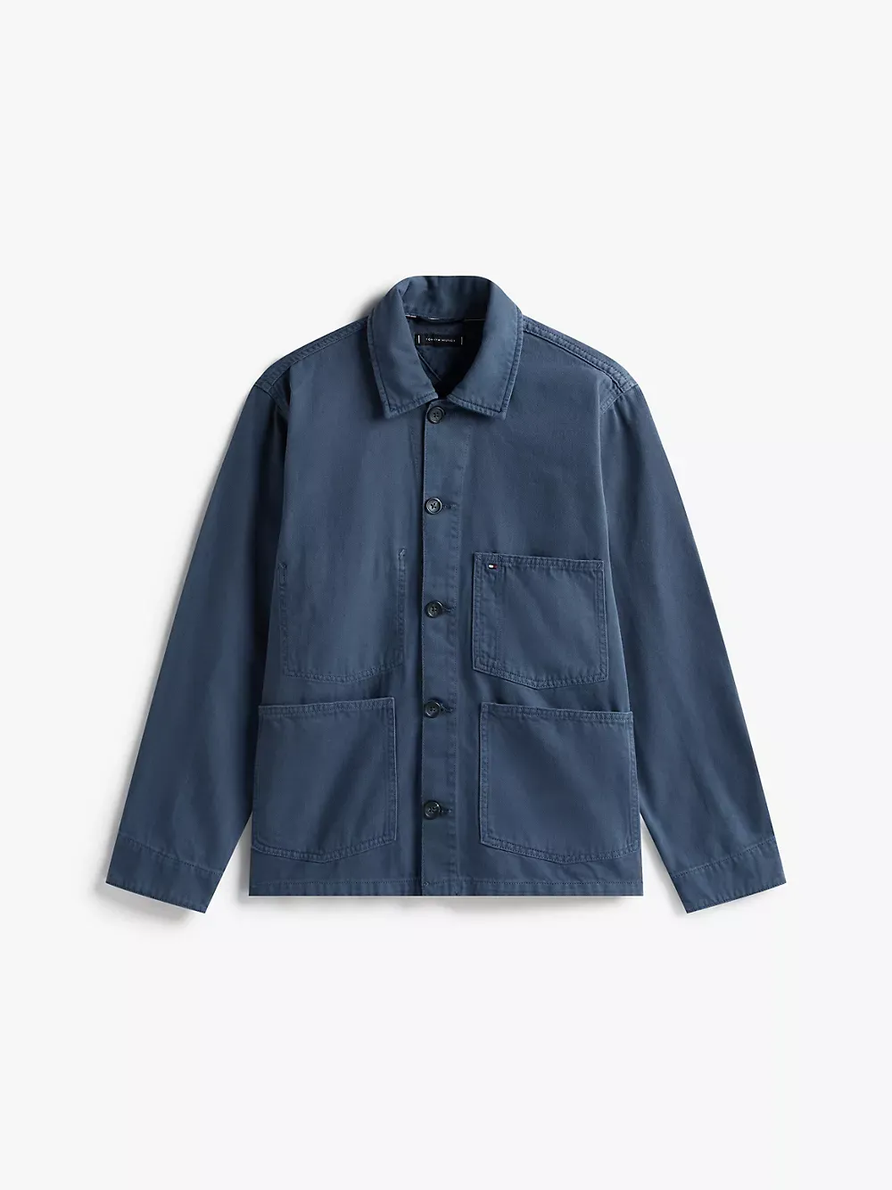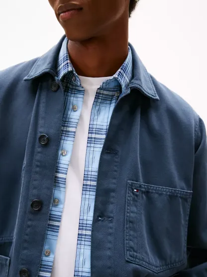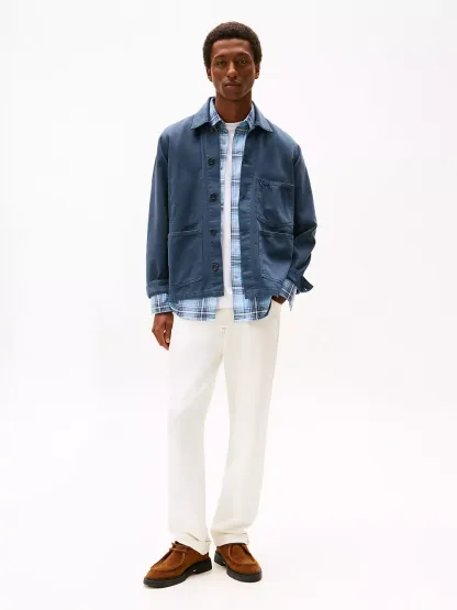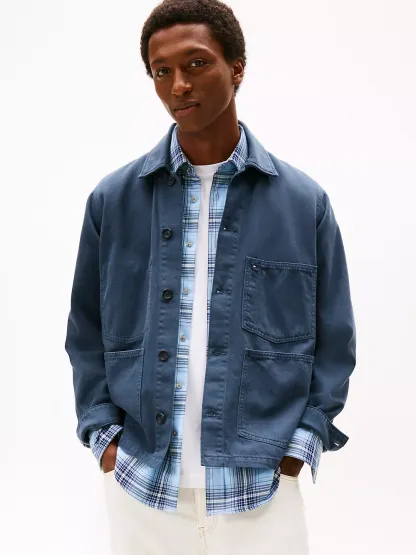 Tommy Hilfiger men's jacket. Inspired by the workwear staple, our rigid denim chore jacket has it all — roomy patch pockets, easy-roll sleeves and traditional faux horn buttons. Even better, this versatile outerwear layer is garment-dyed for softness and a lived-in look.