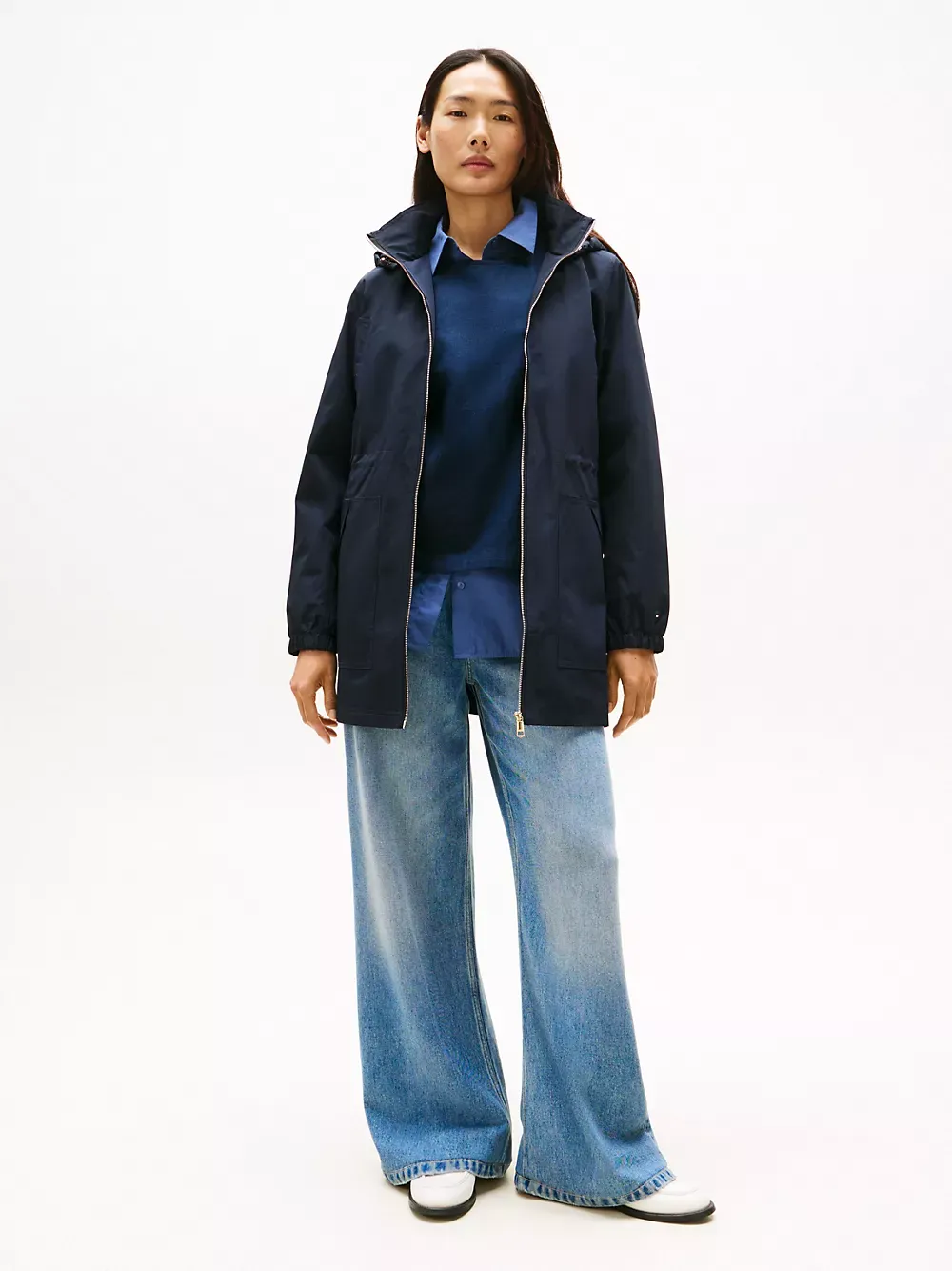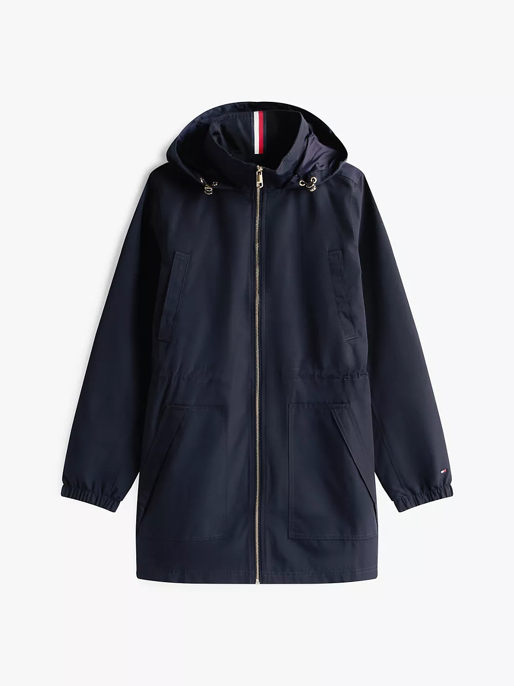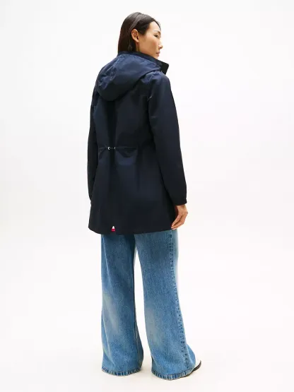 Tommy Hilfiger women's jacket. Our lightweight jacket keeps you covered, thanks to the longline silhouette and bungee drawstring hood. Elastic cuffs and and a channeled bungee waist protect from cool breezes during transitional weather days.
