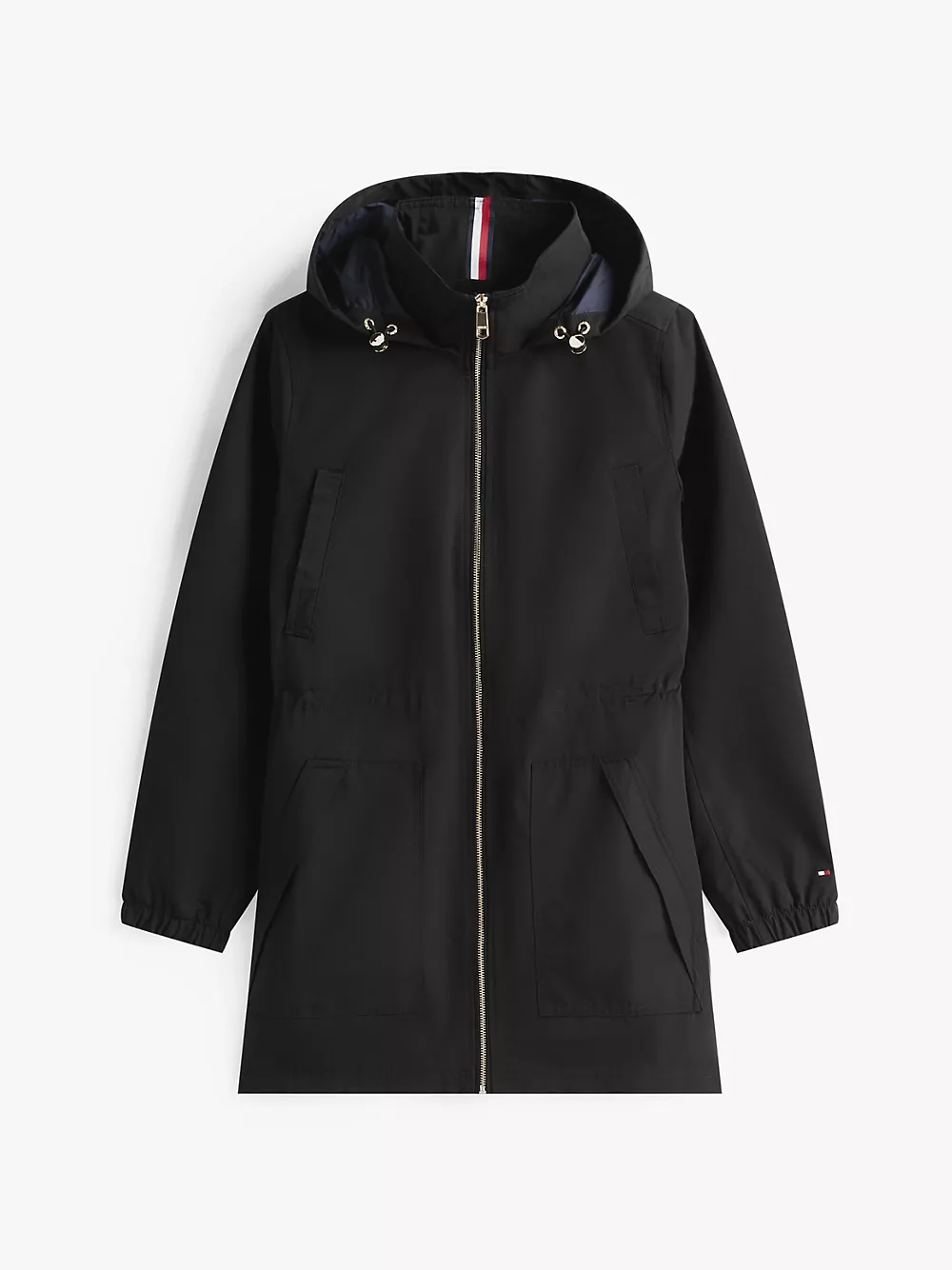 Tommy Hilfiger women's jacket. Our lightweight jacket keeps you covered, thanks to the longline silhouette and bungee drawstring hood. Elastic cuffs and and a channeled bungee waist protect from cool breezes during transitional weather days.