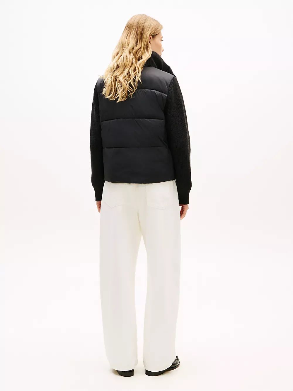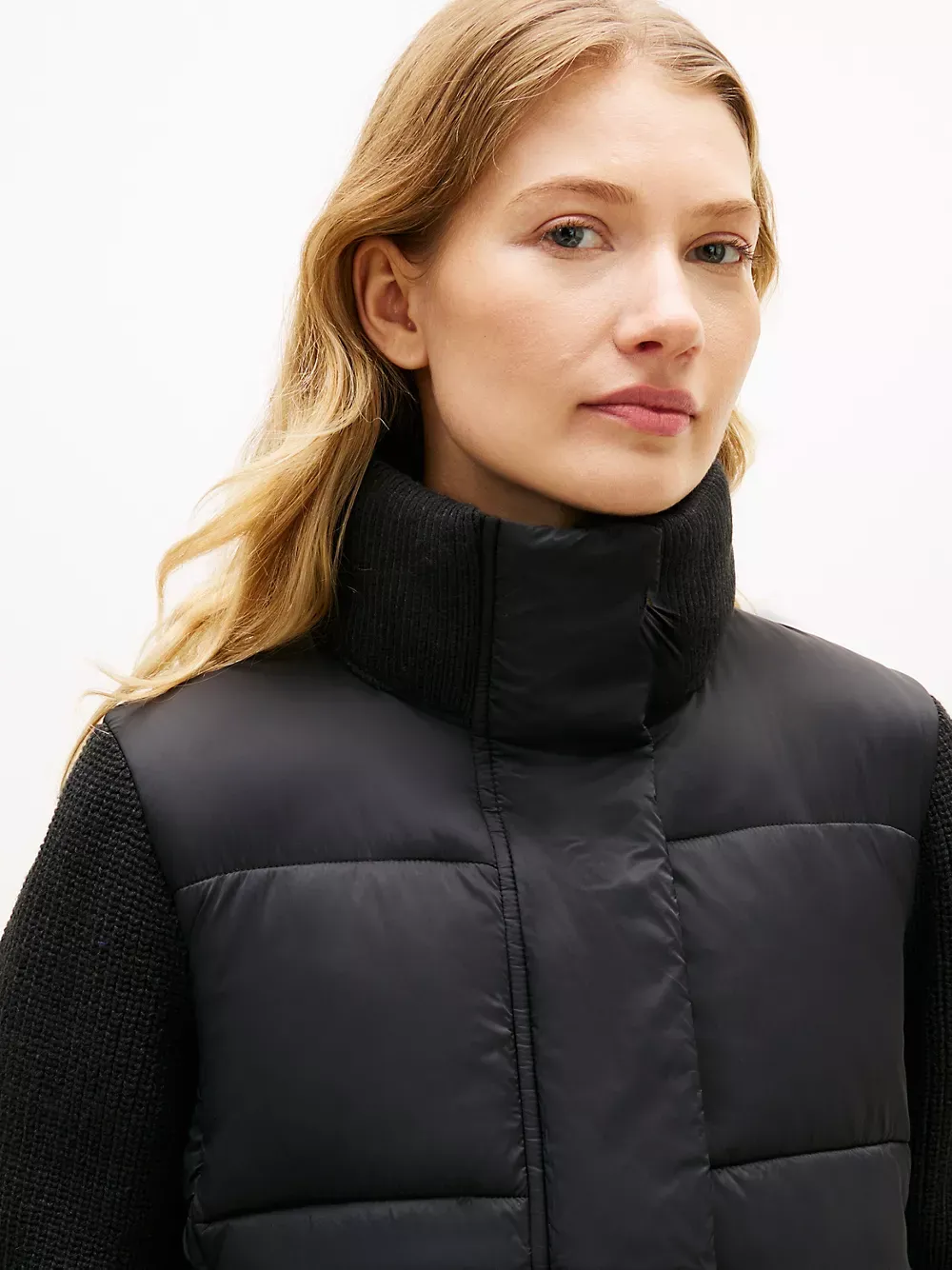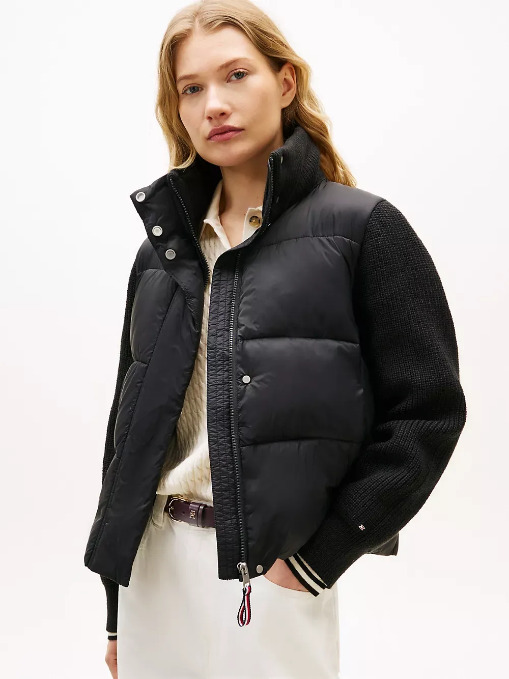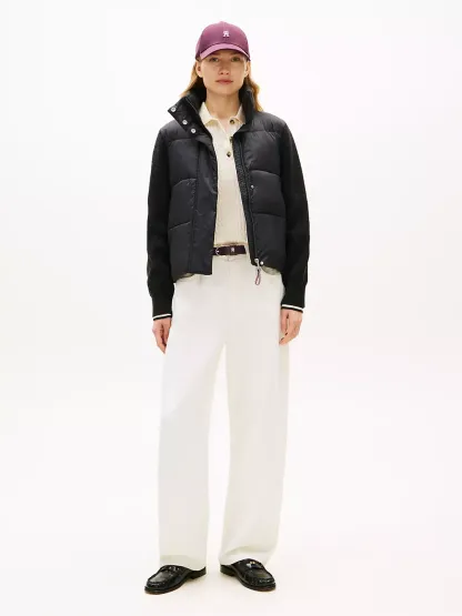 Tommy Hilfiger women's jacket. Cozy like your favorite cardigan and warm like your trusted puffer, this mixed media jacket is constructed with an insulated core, a ribbed collar and toasty knit sleeves.