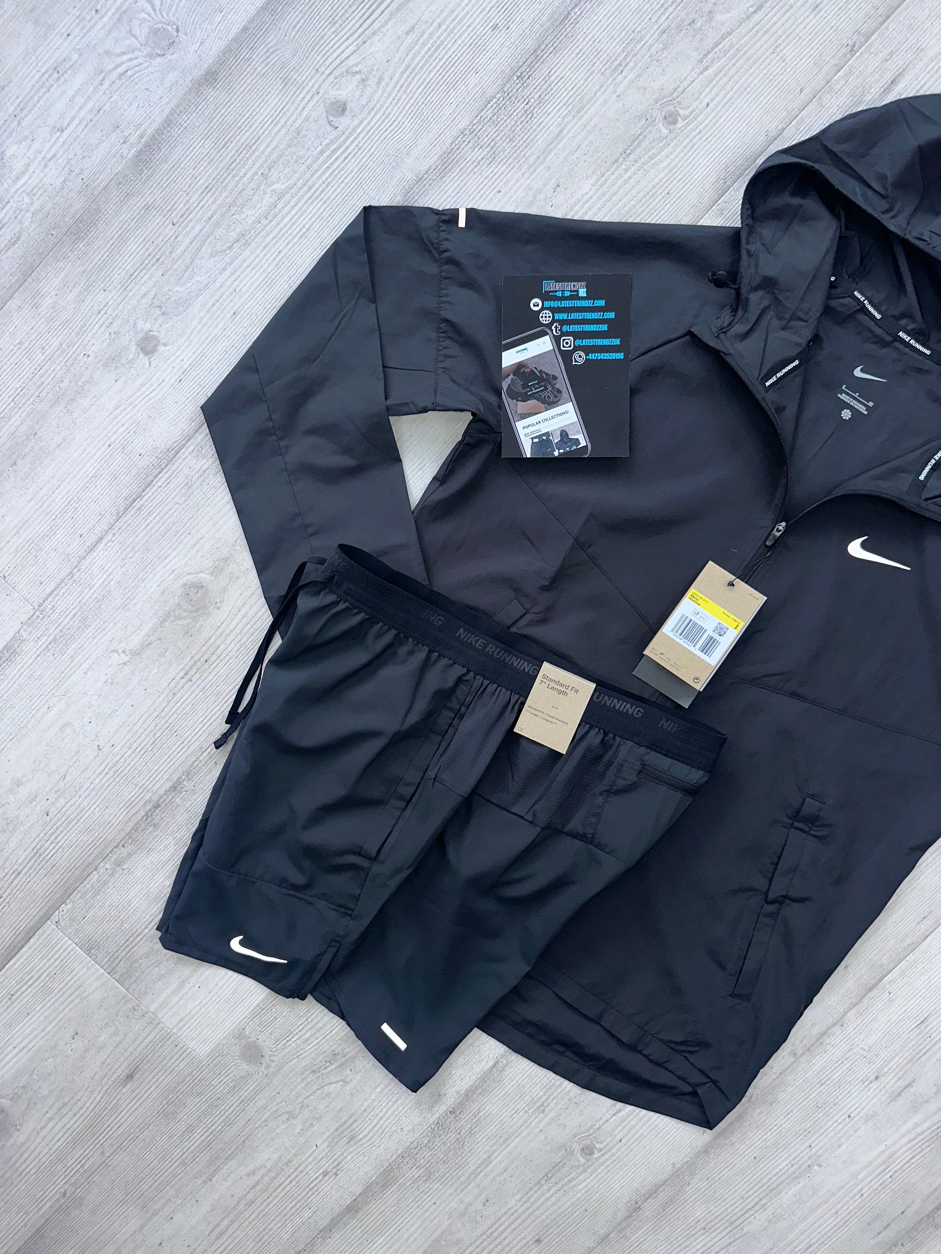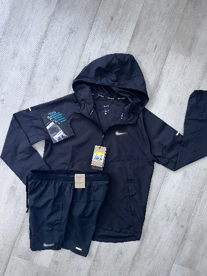 Expertly crafted for outdoor training, the NIKE REPEL JACKET SET in Black offers water-repellent protection with adjustable hood and snap button pockets. The lightweight and breathable Nike Stride Shorts ensure unrestricted movement while featuring a convenient phone pocket. Stay dry and hands-free on your runs.