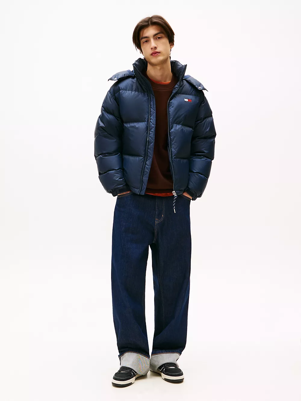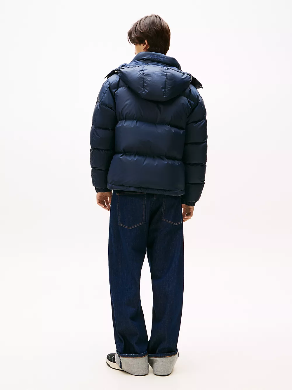 Tommy Hilfiger men's jacket. Made from durable ripstop and filled with down insulation, our hooded puffer resists snags and tears and delivers on warmth. Boasting these cold-weather credentials, it's the ideal companion for an outdoor winter adventure. Part of our Tommy Jeans collection.