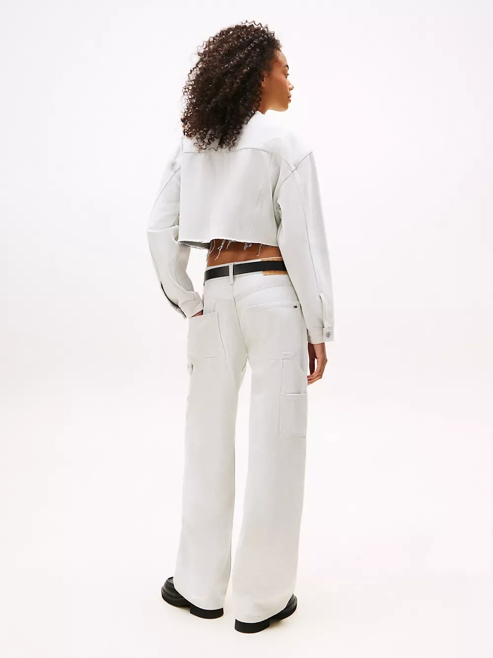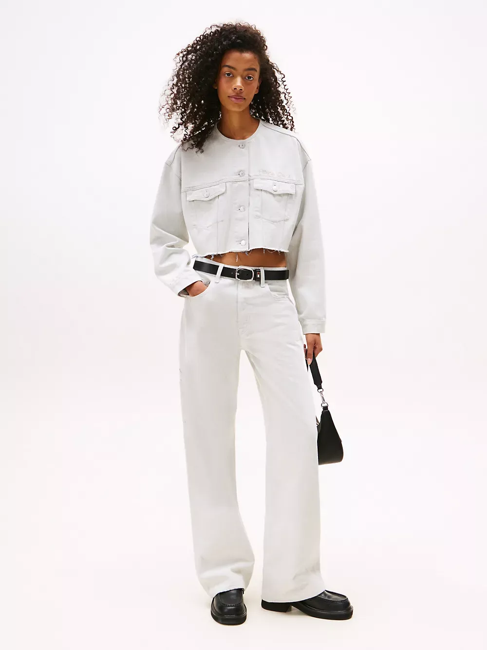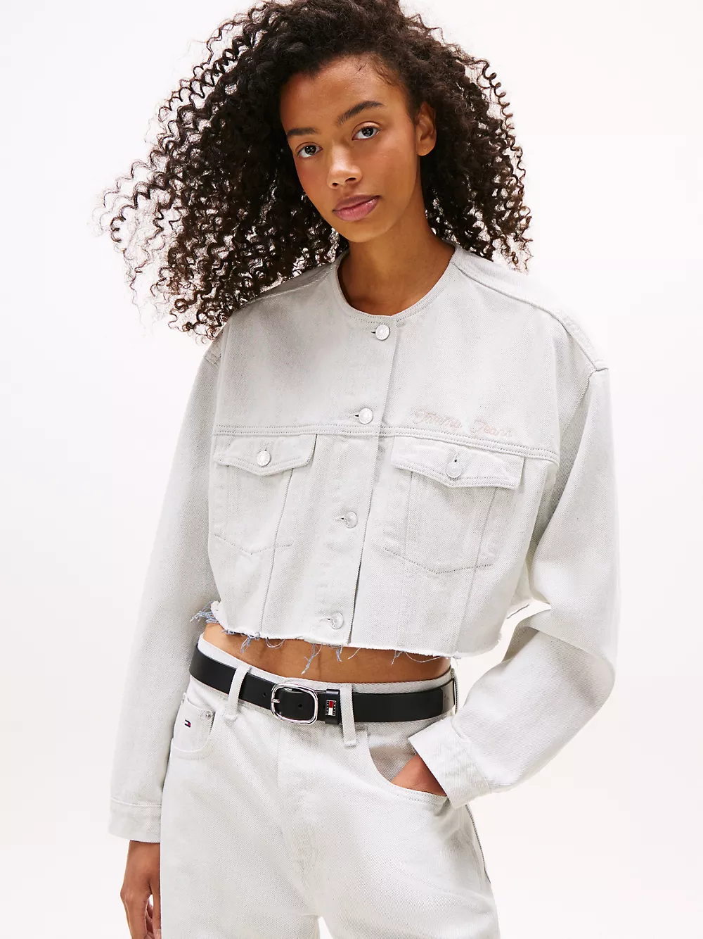 Tommy Hilfiger women's jacket. Cut for a boxy, comfortably oversized fit, this collarless denim jacket is designed with a raw, cropped hem that adds a lived-in look and vintage appeal. Part of our Tommy Jeans collection.