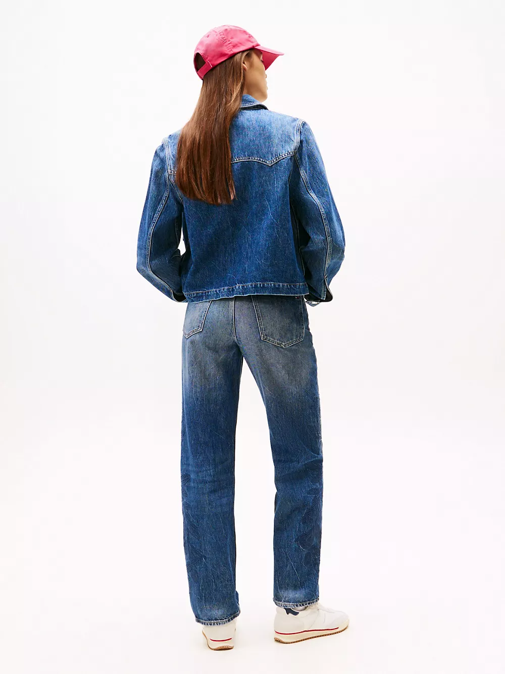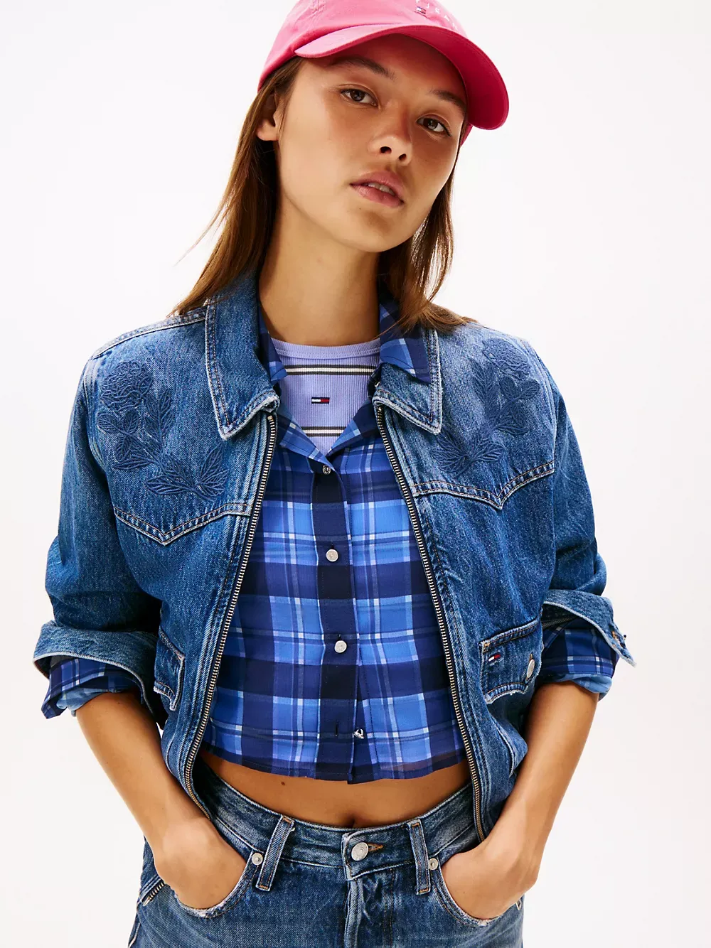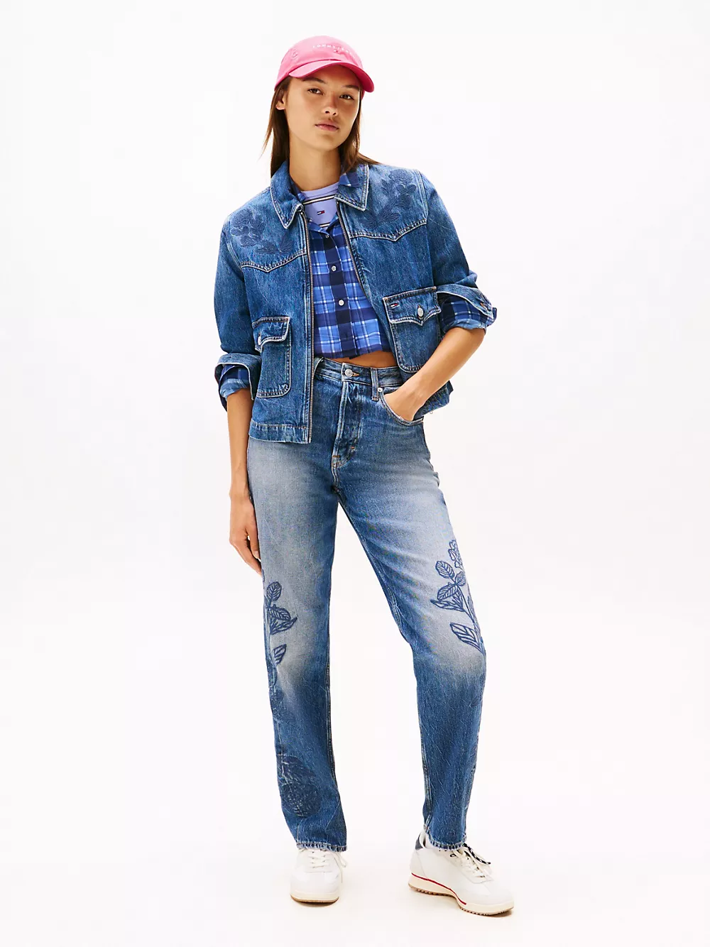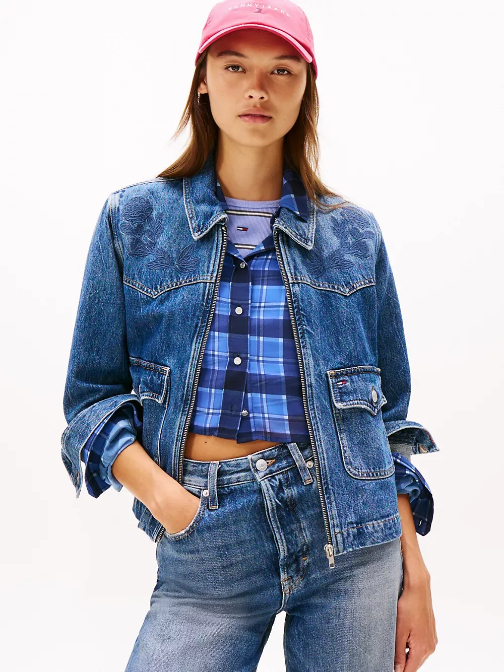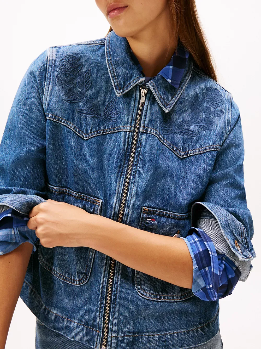 Tommy Hilfiger women's jacket. This zip coach jacket is cut in an effortlessly cool, relaxed fit. Made from rigid denim, it features intricate floral embroidery and faded detailing for vintage vibes. Part of our Tommy Jeans collection.