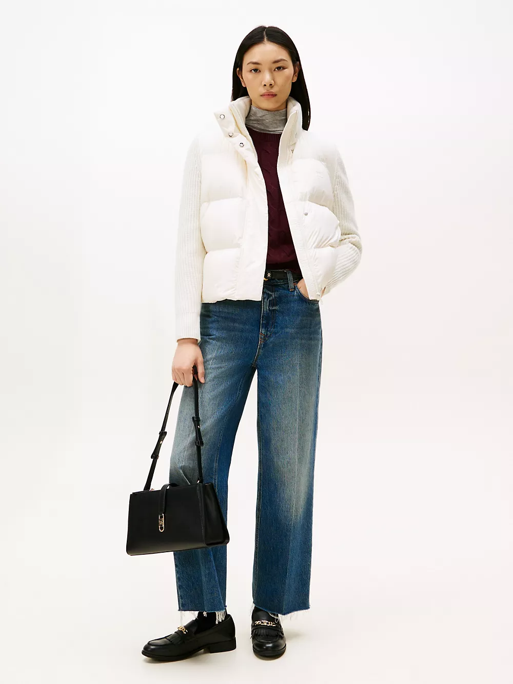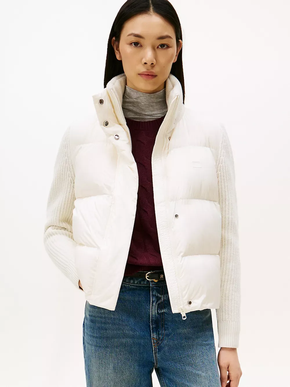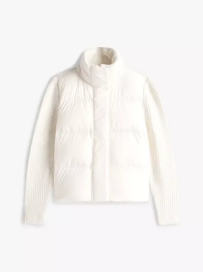 Tommy Hilfiger women's jacket. Cozy like your favorite cardigan and warm like your trusted puffer, this mixed media jacket is constructed with an insulated down core, a ribbed collar and toasty wool sleeves.