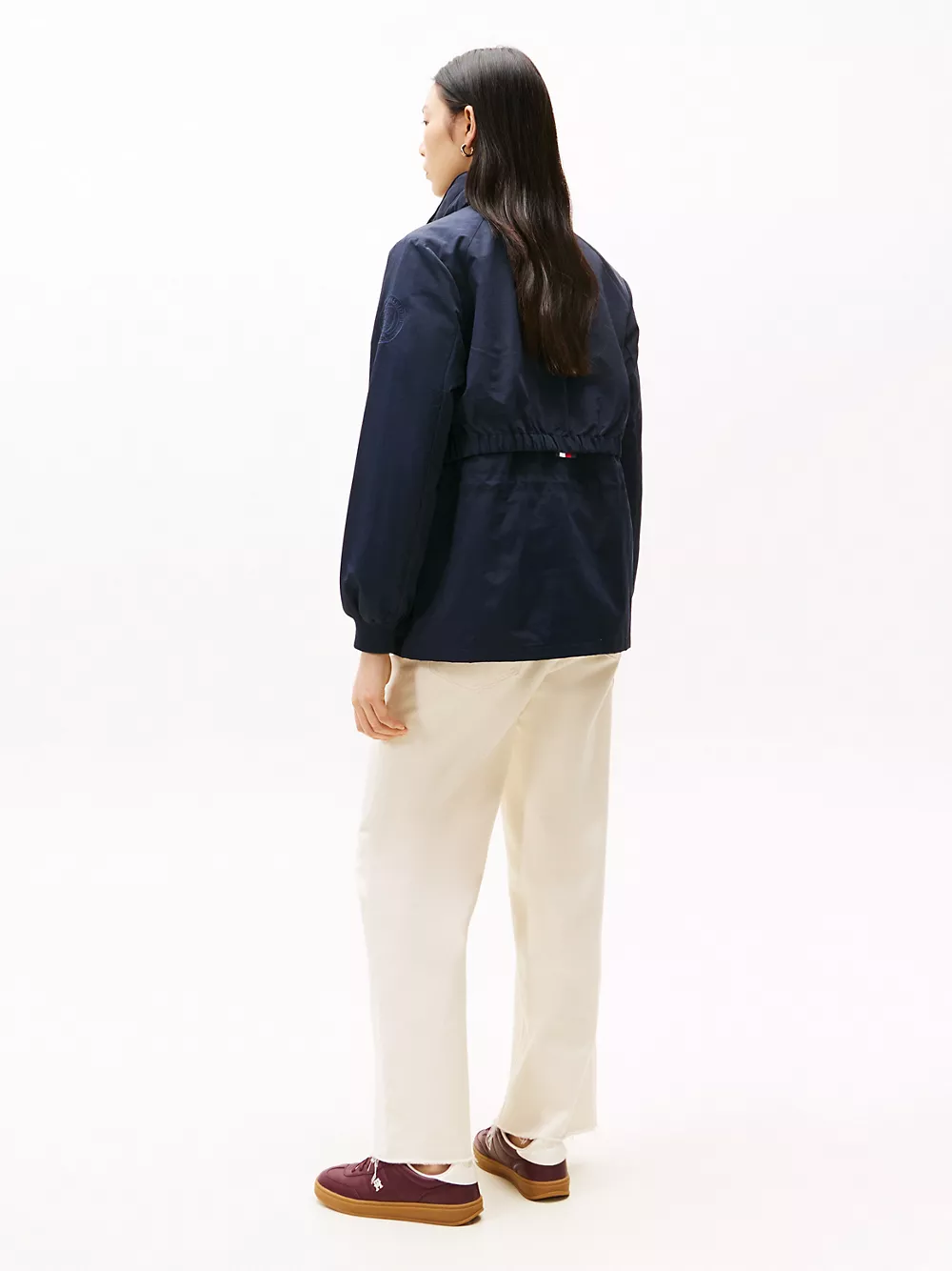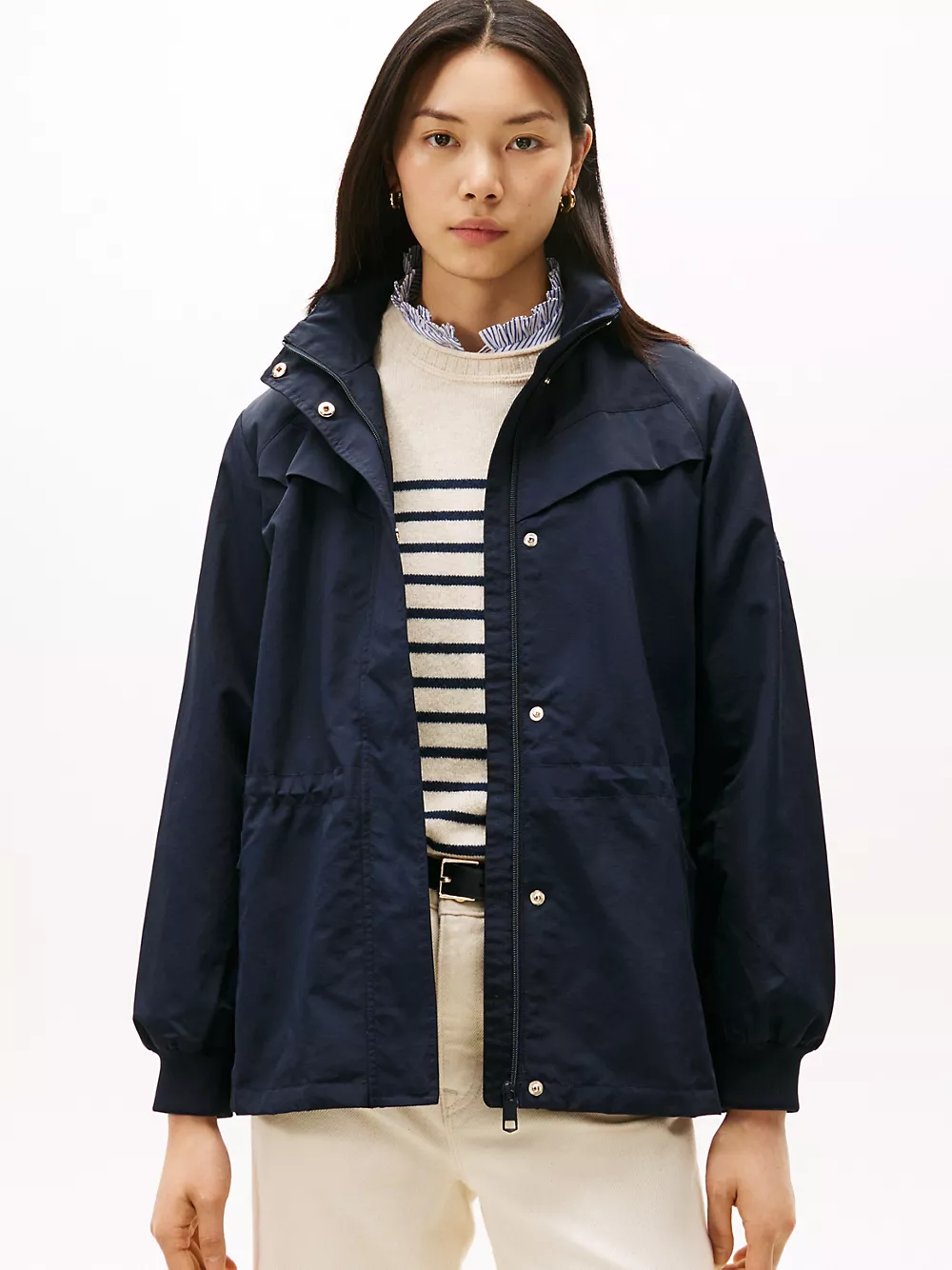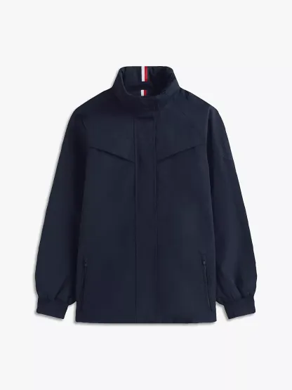 Tommy Hilfiger women's jacket. Our lightweight yacht jacket keeps the elements at bay without compromising on a flattering fit. Designed with a drawcord waist, a hidden hood at the collar, and a funnel neck, it seamlessly blends style and utility.
