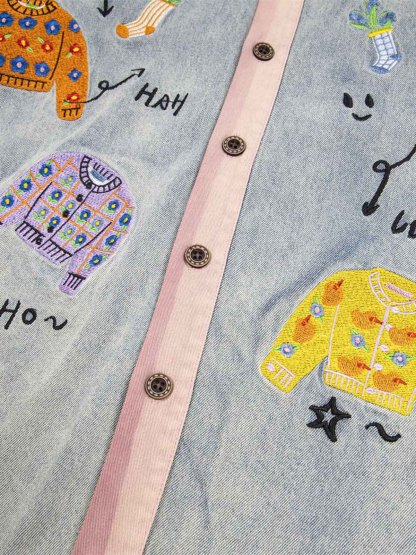 • Design Elements: Vibrant embroidered sweater patches, playful text details, and floral accents