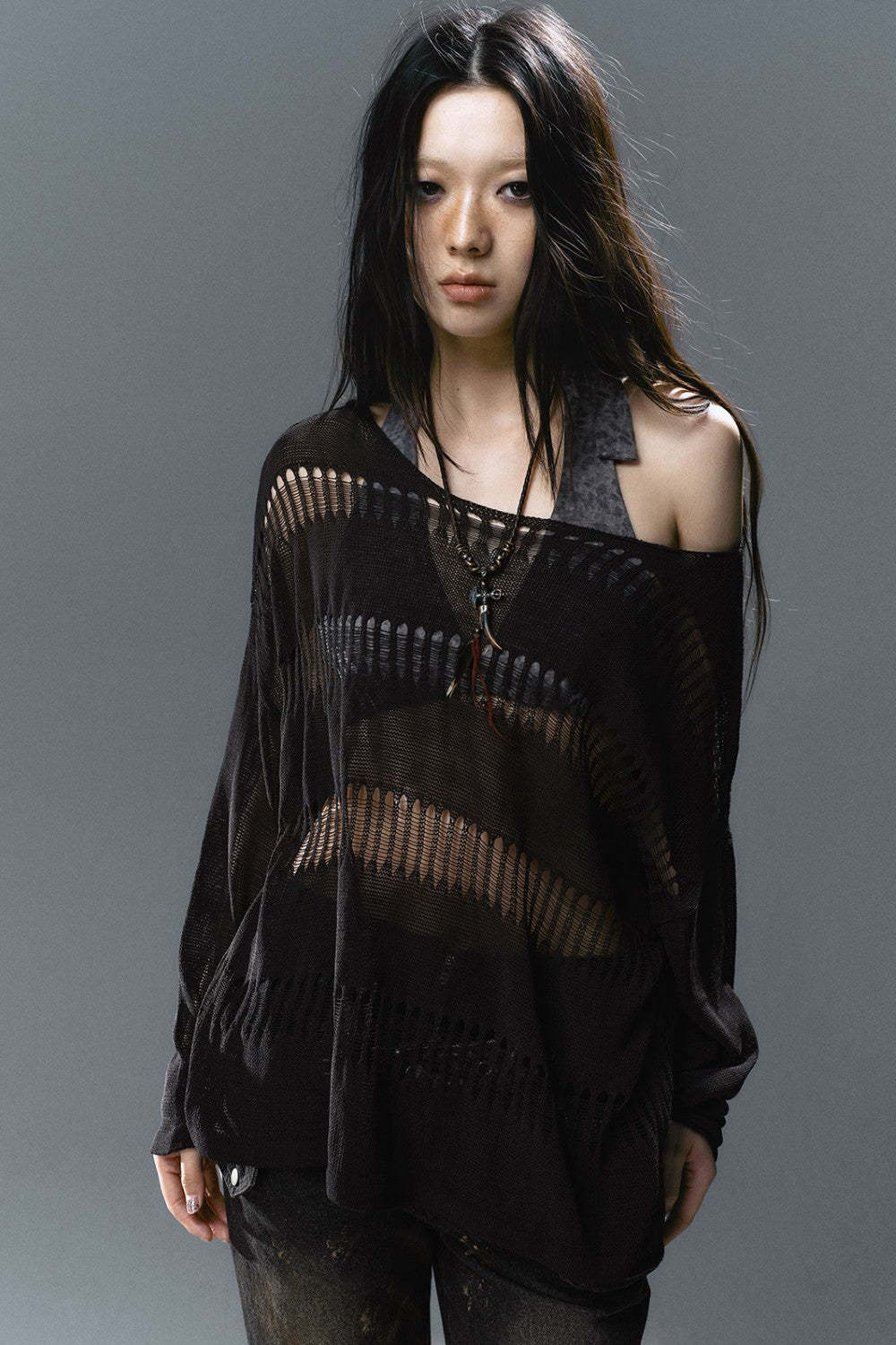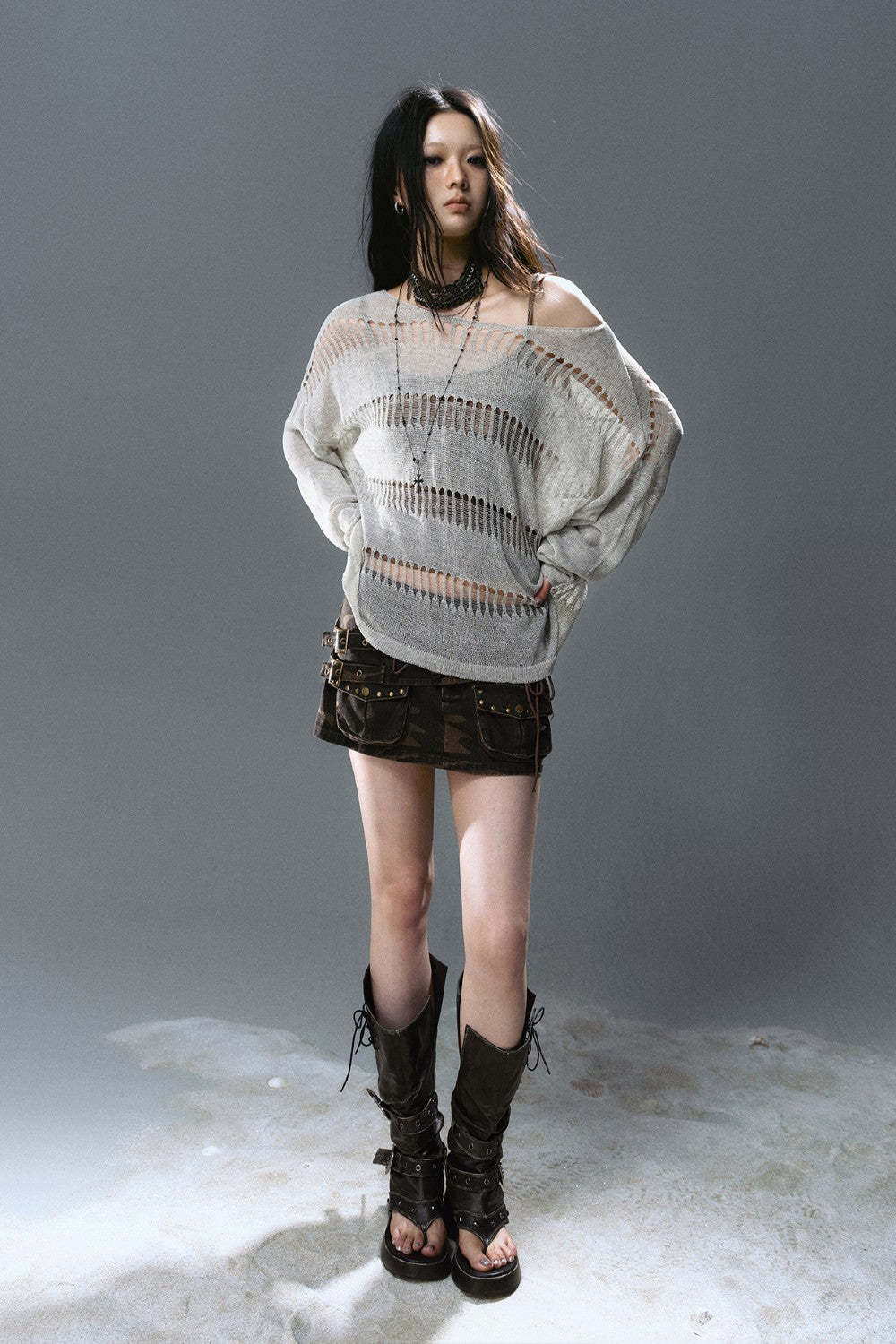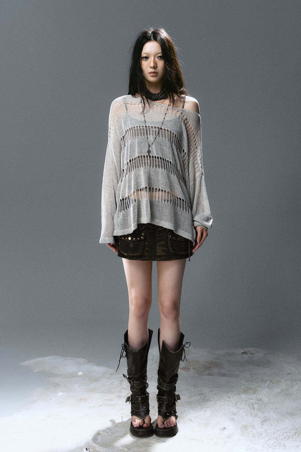 - Lightweight open-knit fabric with laddered holes