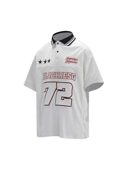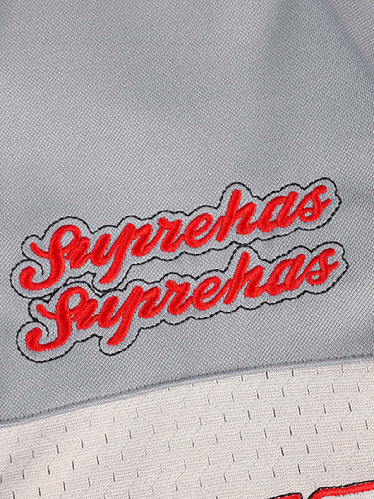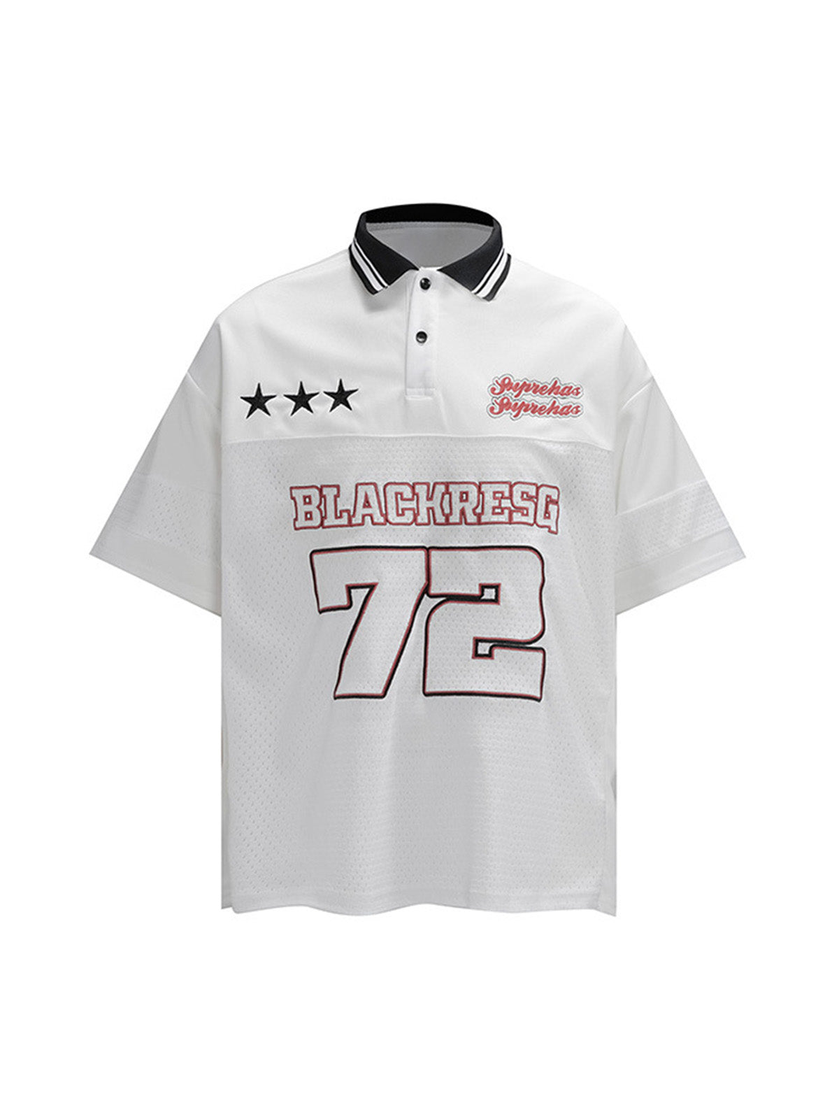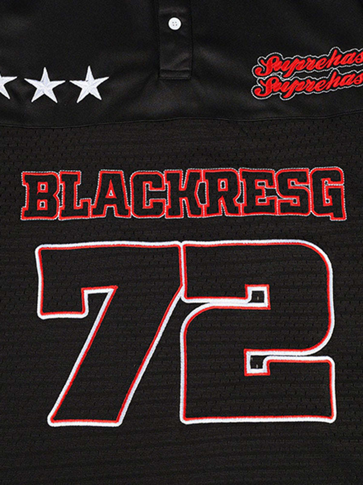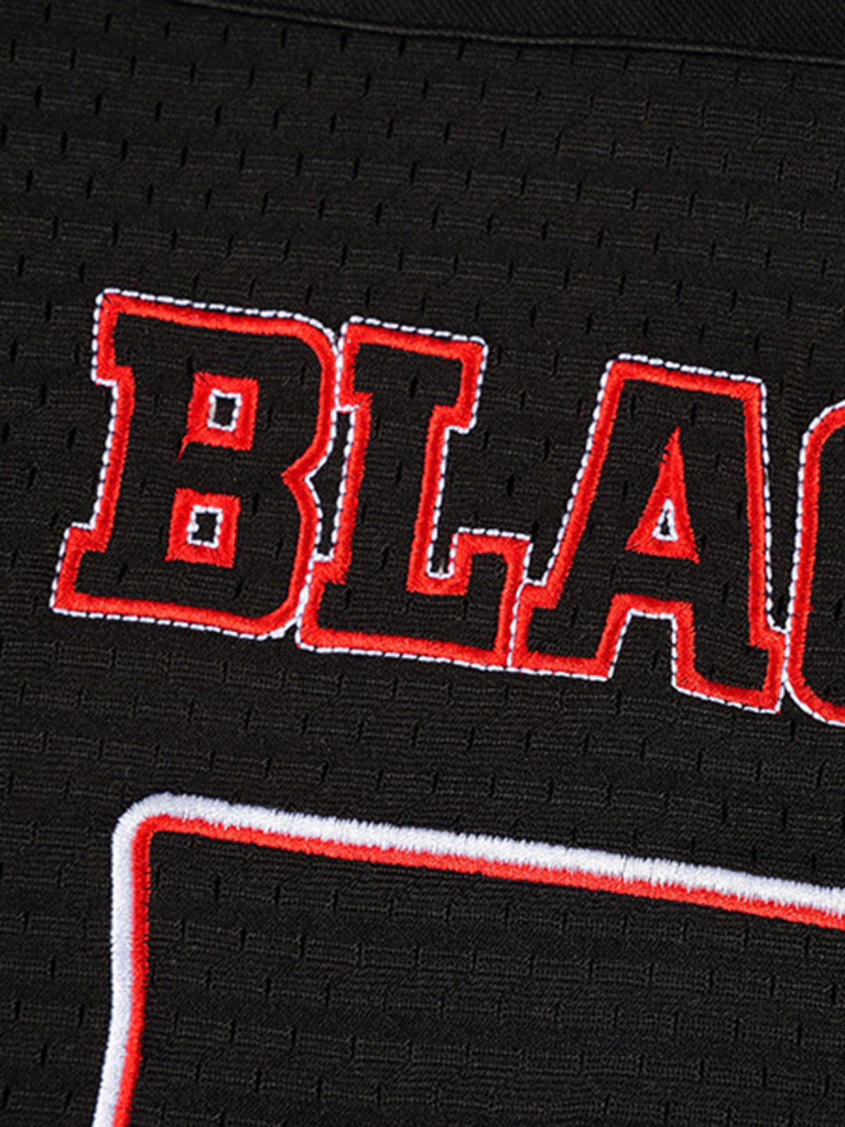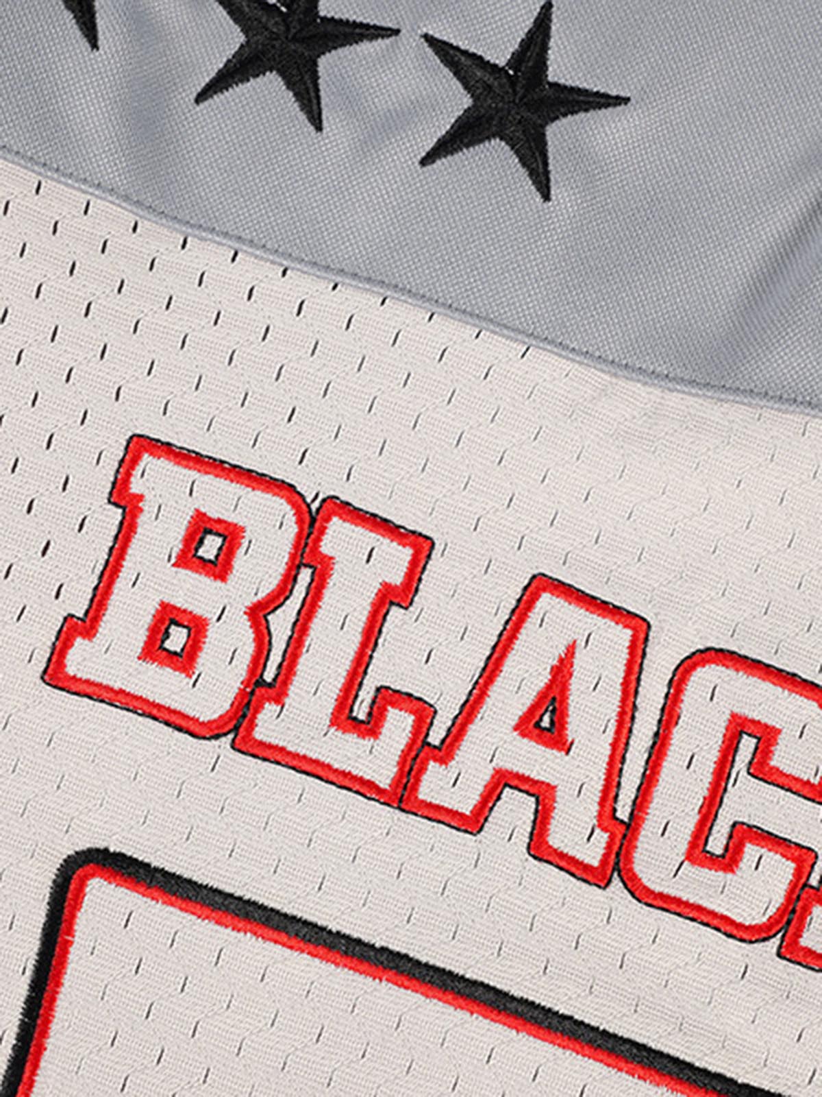 • Design Elements: Embroidered stars and text, mesh paneling, bold number print