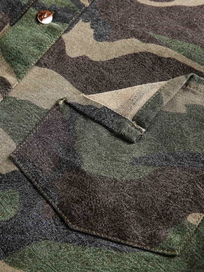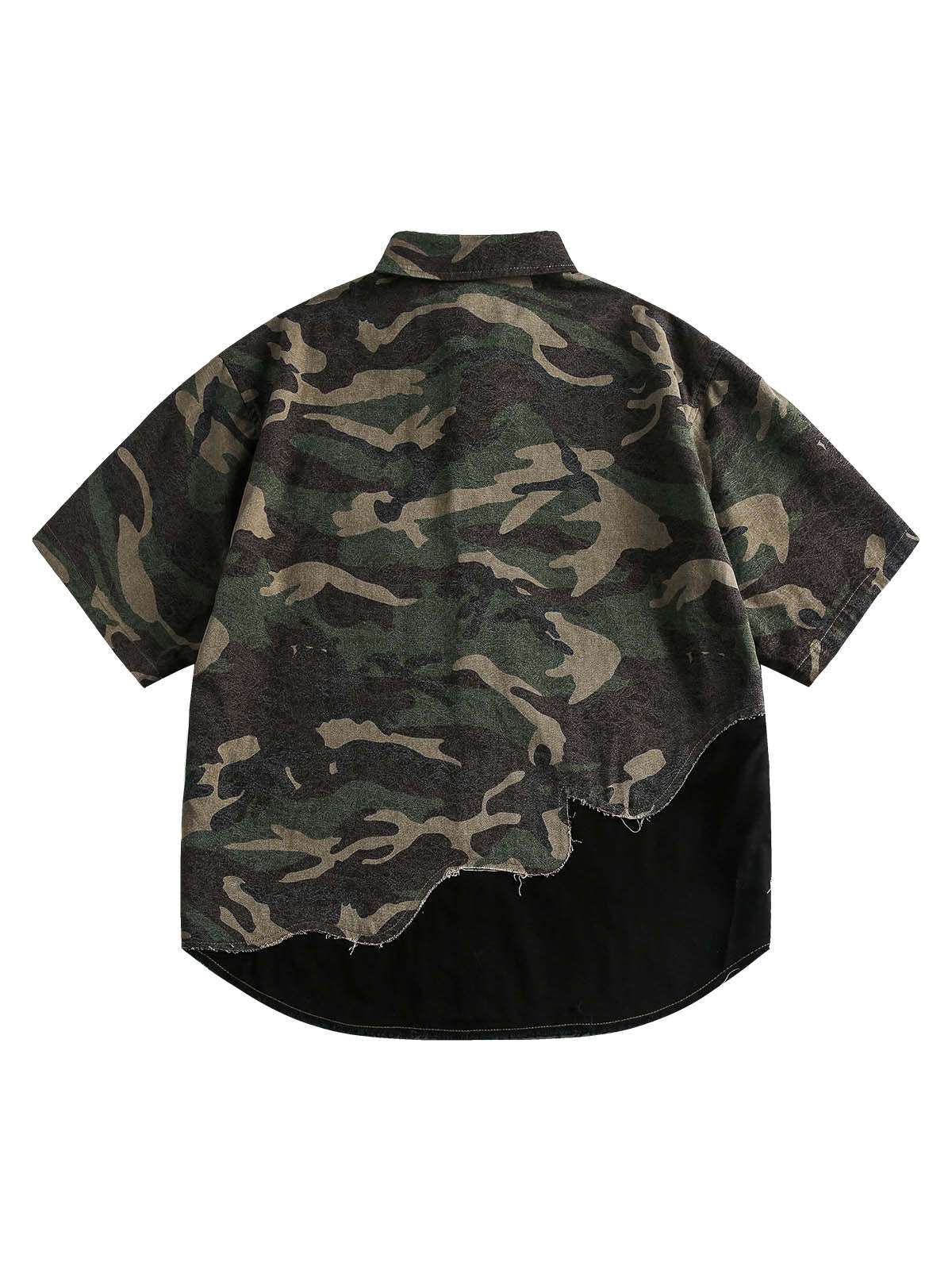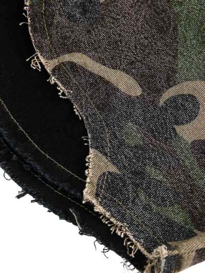 • Design Elements: Vertical lettering detail, camouflage pattern, frayed hem