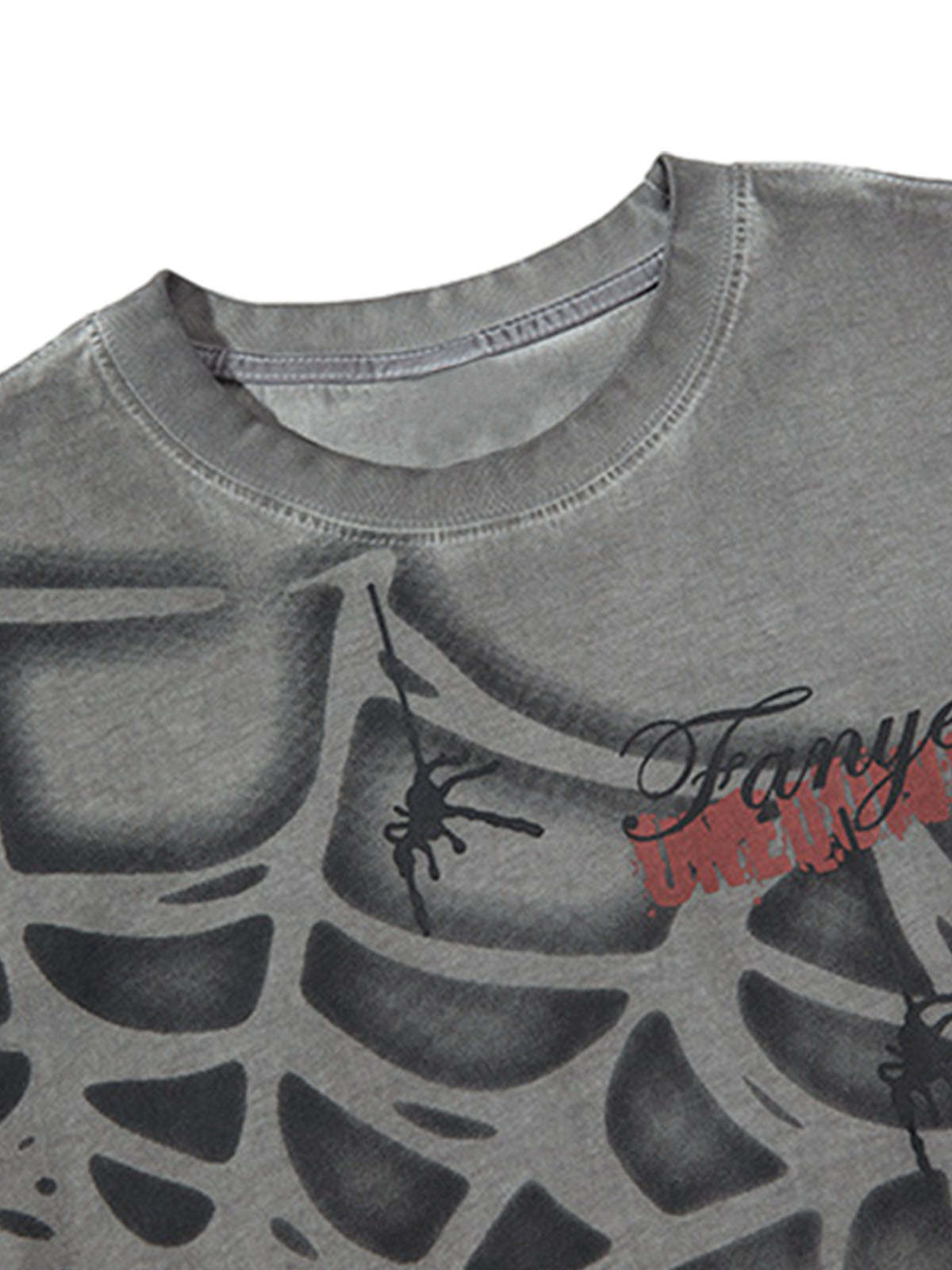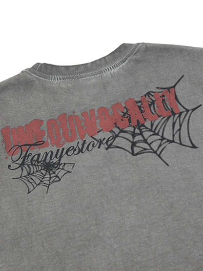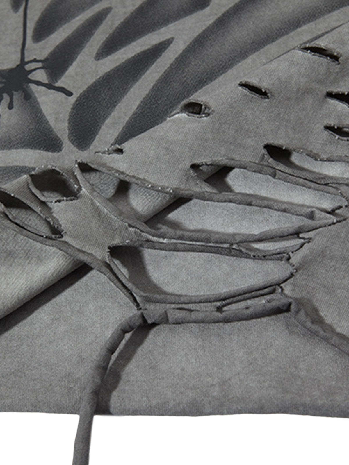 • Design Elements: Distressed edges, spiderweb graphic print, lace-up bottom hem